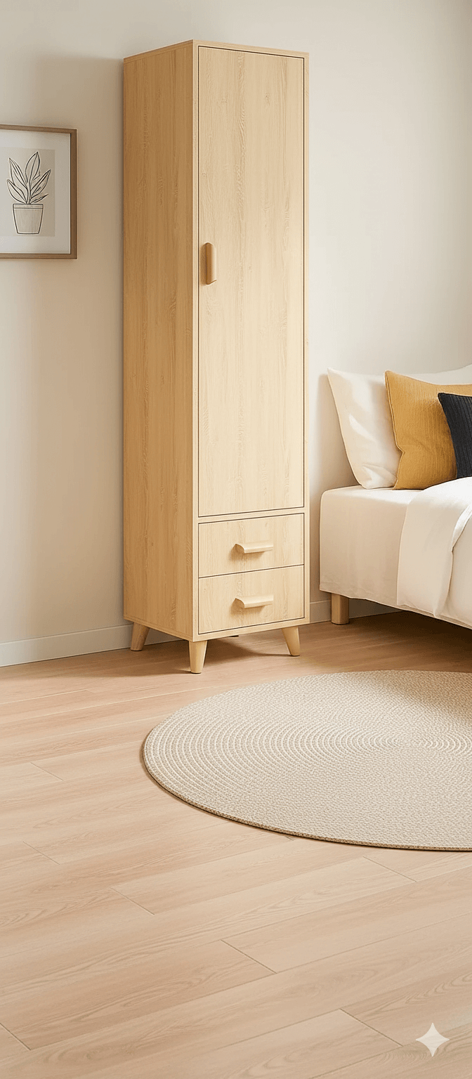 Armoire 1 porte couleur beige clair avec deux tiroirs pratiques. Design scandinave moderne, idéale pour chambre ou entrée. Compacte et fonctionnelle pour optimiser votre rangement.