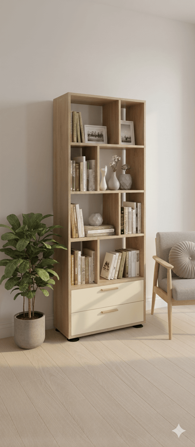 Apportez une touche d’élégance et de fonctionnalité à votre intérieur avec cette bibliothèque moderne au design scandinave. Conçue en panneaux de bois robustes, elle associe une finition beige bois naturel et des tiroirs creme clair avec poignées en bois clair, offrant un contraste harmonieux et chaleureux.