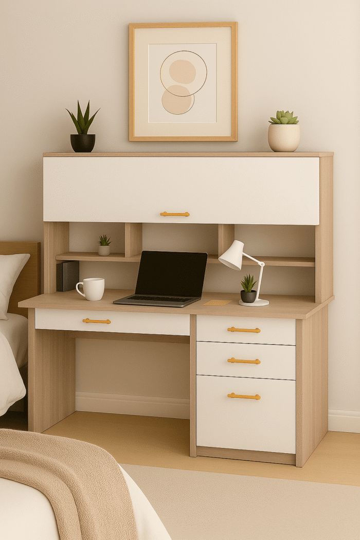 Découvrez le bureau moderne avec rangement intégré et bibliothèque, un choix idéal pour aménager une chambre adulte ou un bureau à domicile. Conçu en beige et blanc au design scandinave, il allie fonctionnalité, style et confort.