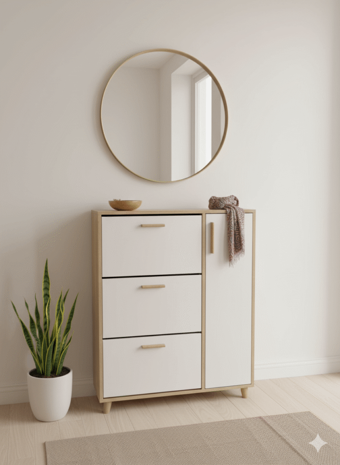 Meuble à chaussures scandinave avec 3 portes, parfait pour une entrée organisée et élégante. Finition beige et blanc, pieds en bois de hêtre pour un style nordique moderne.
