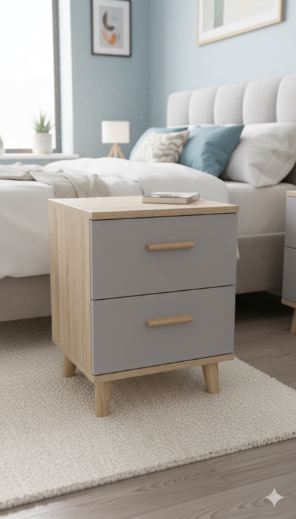 Table de Nuit 2 Tiroirs – Style Scandinave Beige & Gris